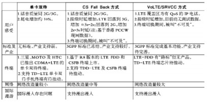 無(wú)論是從用戶體驗(yàn)、網(wǎng)絡(luò)改造難度、終端支持度以及標(biāo)準(zhǔn)和產(chǎn)業(yè)發(fā)展上看,雙待單卡方案、CSFB方案以及VoLTE/SRVCC方案都有著各自的優(yōu)劣勢(shì)(見下表)。總體而言,雙待機(jī)方案在業(yè)務(wù)體驗(yàn)和實(shí)施時(shí)間方面有優(yōu)勢(shì),但終端為定制終端,功耗稍大,國(guó)際漫游存在問(wèn)題,網(wǎng)絡(luò)改造成本最低。CSFB在產(chǎn)業(yè)支持和國(guó)際化程度方面占有較大優(yōu)勢(shì),但業(yè)務(wù)體驗(yàn)預(yù)計(jì)稍差,網(wǎng)絡(luò)改造成本居中。SRVCC需要跨IMS域、CS域、分組域及無(wú)線網(wǎng),業(yè)務(wù)體驗(yàn)有待驗(yàn)證。